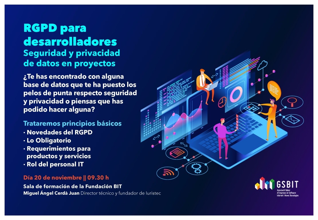 Veremos los principios básicos, novedades del RGPD, lo OBLIGATORIO, requerimientos para productos y servicios y el rol del personal IT.