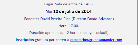 El dia 10 de Julio tendrá lugar la presentación del Fondo Santander Advance Inversión Pymes con Proyecto de Crecimiento dotación 250.000.000€. La acción va dirigida exclusivamente a las organizaciones miembro de CAEB, así como a sus empresas asociadas. Se trata de una fuente de financiación totalmente complementaria a la tradicional pero que se adapta mejor a los proyectos empresariales.